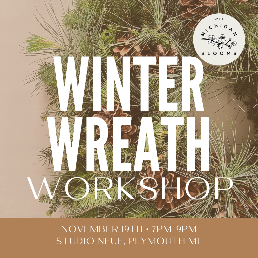 Professional florists, Michigan Blooms, are hosting this festive workshop to kick-off the holiday season. Immerse yourself in the aroma of 3 different types of Michigan grown evergreen, giving your wreath a full, high-end look with lots of color variations and texture. No prior knowledge or skills required. Class includes: ✨Guided instruction ✨Wire wreath base ✨Fresh Michigan evergreens,pinecones, a bow ✨Pruners/supplies to use ✨Michigan Blooms apron ✨Lite bites + drinks